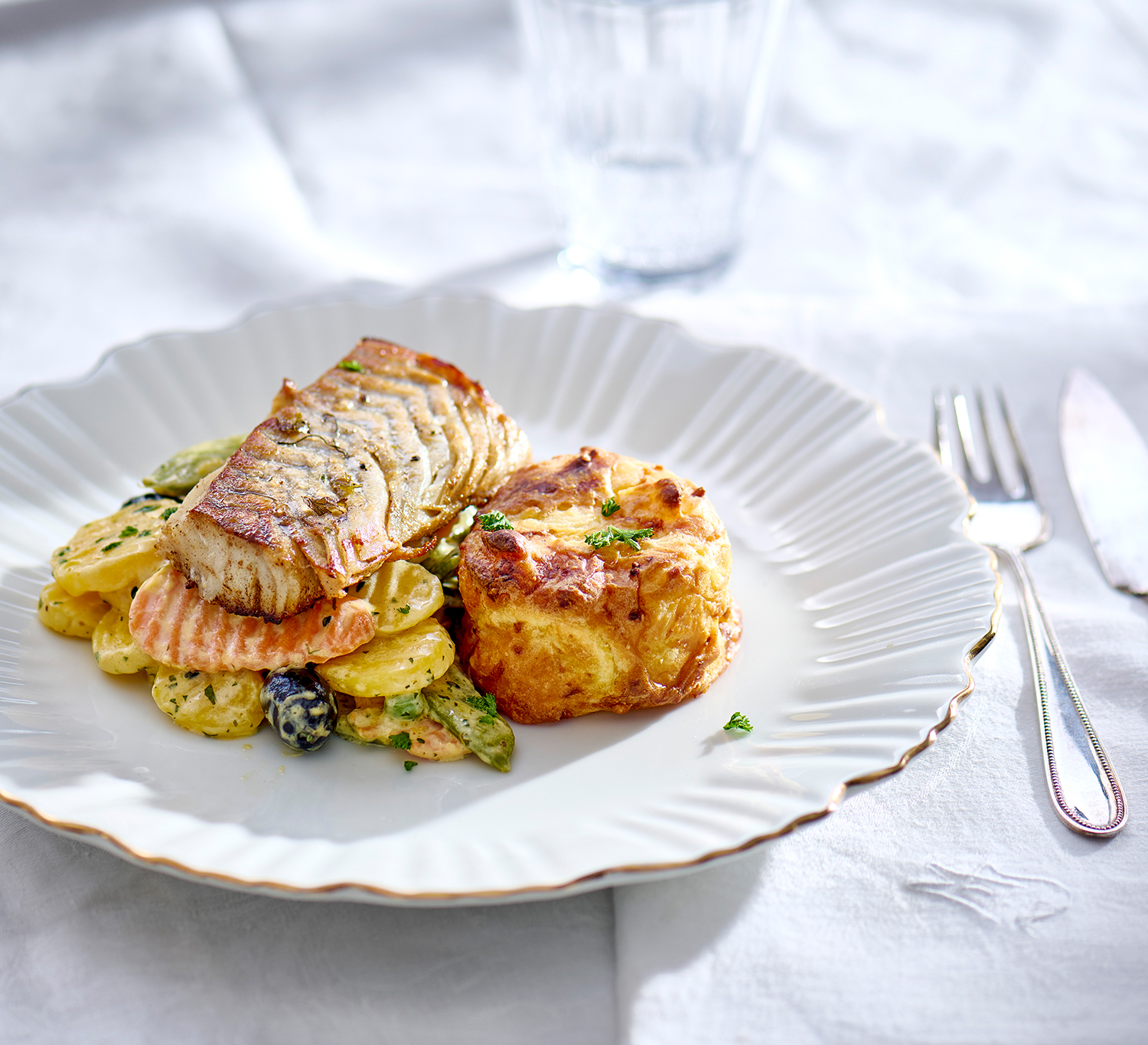 Sült tőkehal karaj korianderes citrusos-olívás pirított zöldségkörettel és gratin burgonyával