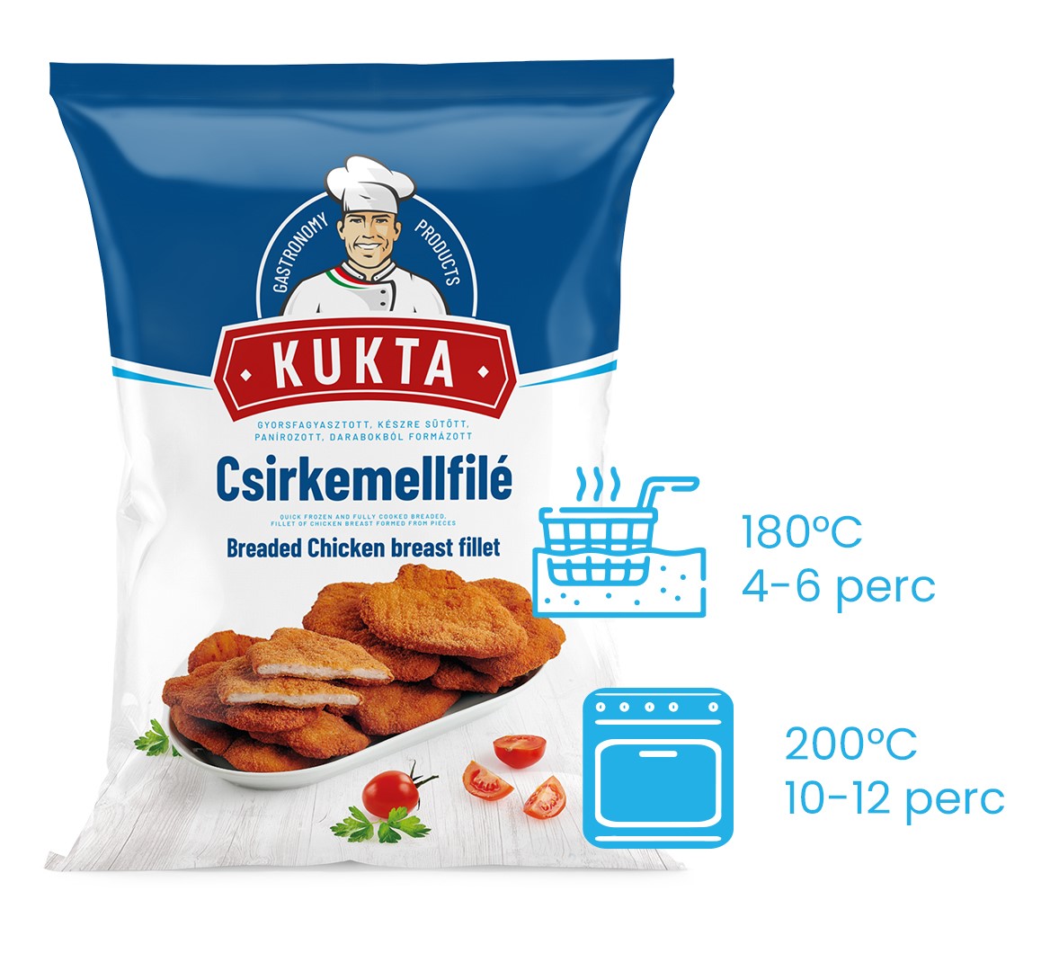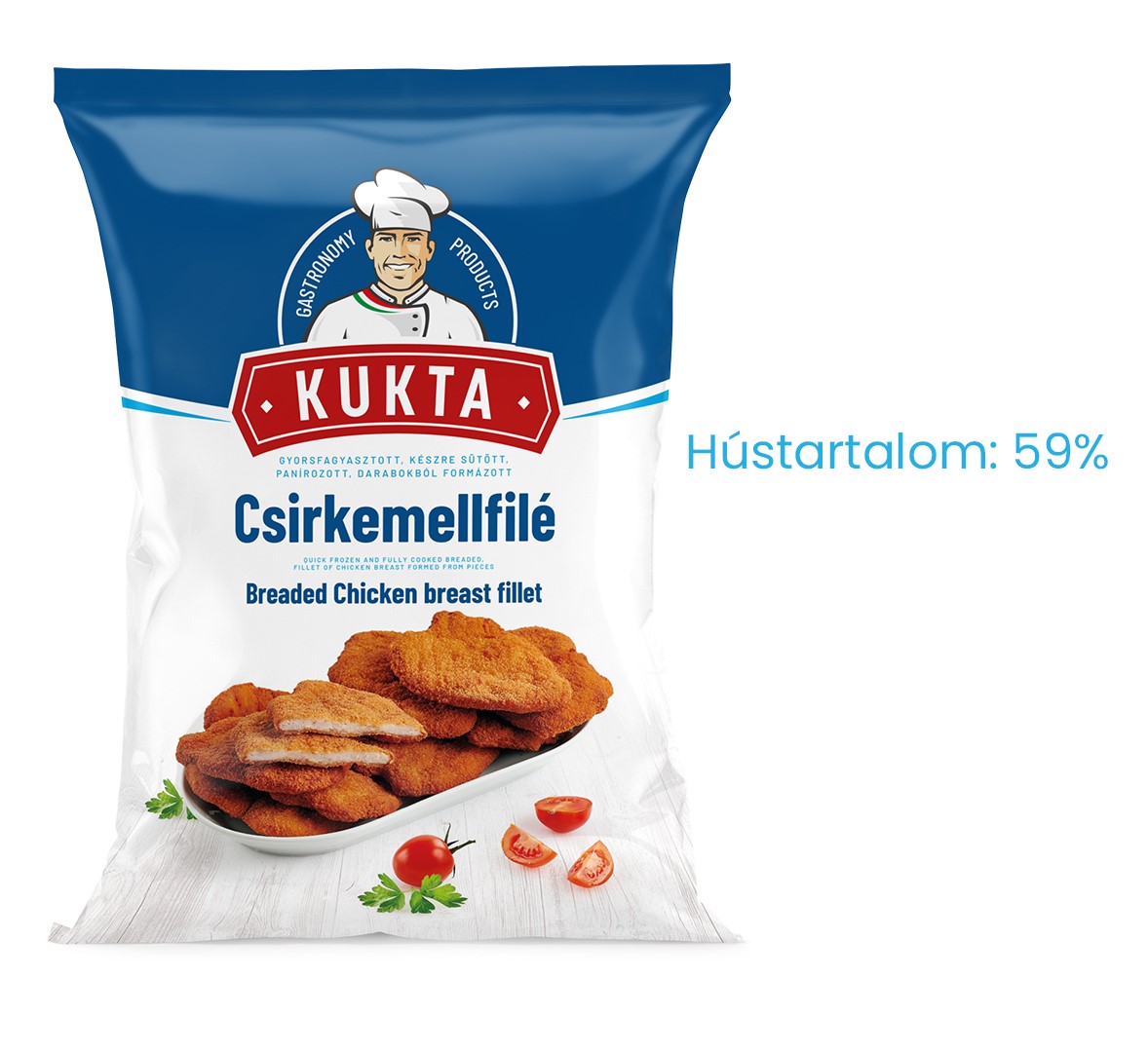 Csirkemellfilé 59%, morzsa (búzaliszt, élesztő, étkezési só, fűszerek), ivóvíz, búzaliszt, növényi olajok (napraforgó, repce), étkezési só, dextróz, szójafehérje, stabilizátorok: di- és trifoszfátok, módosított keményítő, sűrítőanyagok: szentjánoskenyérliszt és E415, zselésítőanyag: karragén, antioxidáns: nátrium-aszkorbát és aromák.