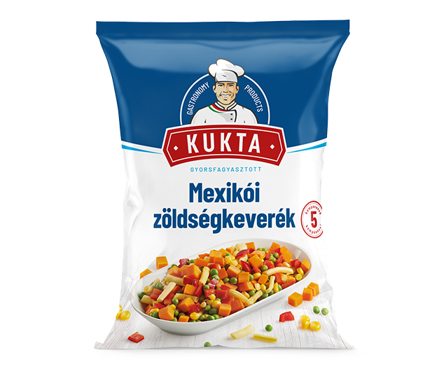 Morzsolt kukorica, sárgarépa kocka, zöldborsó, vágott zöldbab, paradicsompaprika kocka.